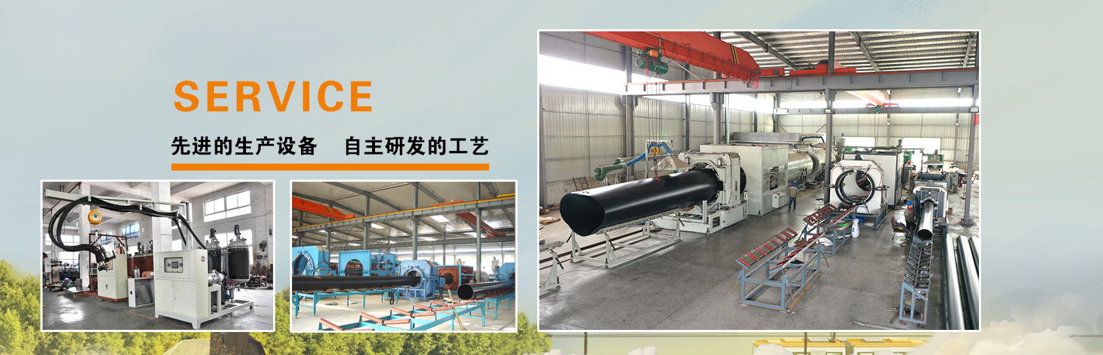 河北巨擎管道制造有限公司公司實力不斷加大,先后購置了多臺先進的生產設備:真空定徑擠出機9臺,采用先進的螺旋模具擠出、真空定徑、噴淋冷卻、自動切割等工藝,年生產 Ø90-Ø1980 聚乙烯外護管4萬噸。擁有PU600、PU300、PU200 三種型號發泡機及相配套的穿管設備和發泡平臺,年產DN50-DN1600 保溫管道 15萬公里,保溫管件3萬件;拋丸機2臺、電暈設備4臺、電熱熔套袖生產設備3臺。做到了自動化,模具化,現代化生產。